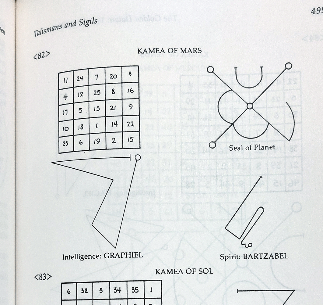 Well, this part is actually easy. The little panel the man is wearing on his chest carries on it the sigil of Mars as derived from the ‘magic square’ of Mars. A ‘magic square’ is a grid of numbers, the arrangement of which enables all the different lines to add up to the same total. A bit like an occult sudoku. In the case of the Martian magical square, it is a grid of 5x5 (containing the numbers 1-25). Five is the number of ‘Geburah’, as it is the fifth sepher or ‘sphere’ from the qabalistic Tree of Life.
