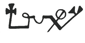 Given the Hebraic nature of the name Camael I looked at the Hebrew letters on the block that I could translate, and indeed, to the left of the man’s shoulder (as we look at the image of the block) we can see four Hebrew characters. Now, Hebrew is read right-to-left, but as this block is itself a mirror image (because of the way block printing works) the Hebrew letters are given in the correct order: Reading from left to right are the letters Kaph, Meme, Aleph, Lamed. KMAL, Kamael. My source was right. Further confirming this, the squiggly sigil directly below the letters is indeed the sigil of the Camael, here retrieved from wikipedia: