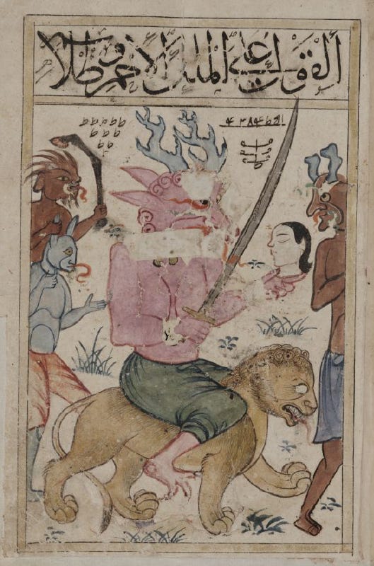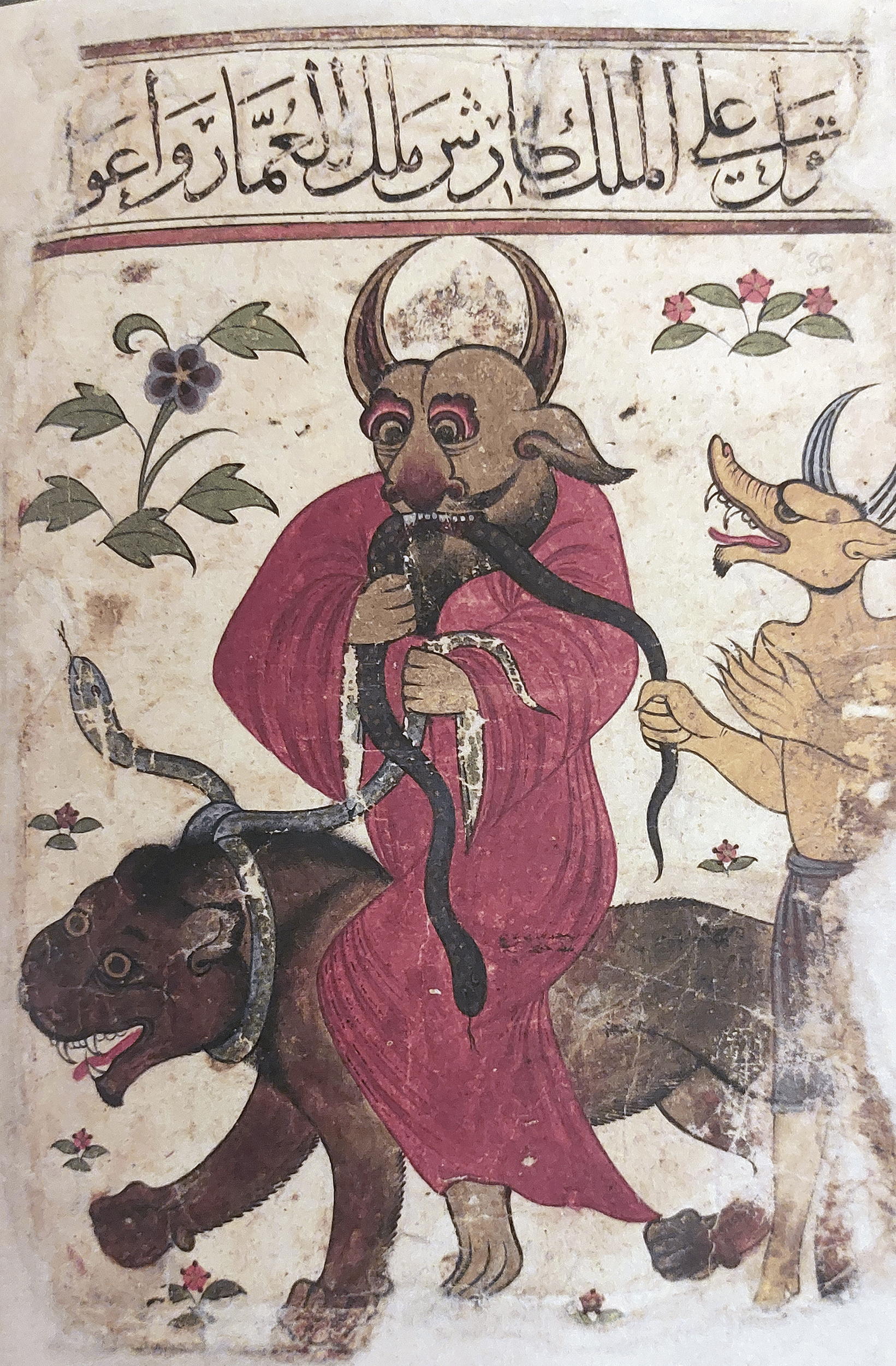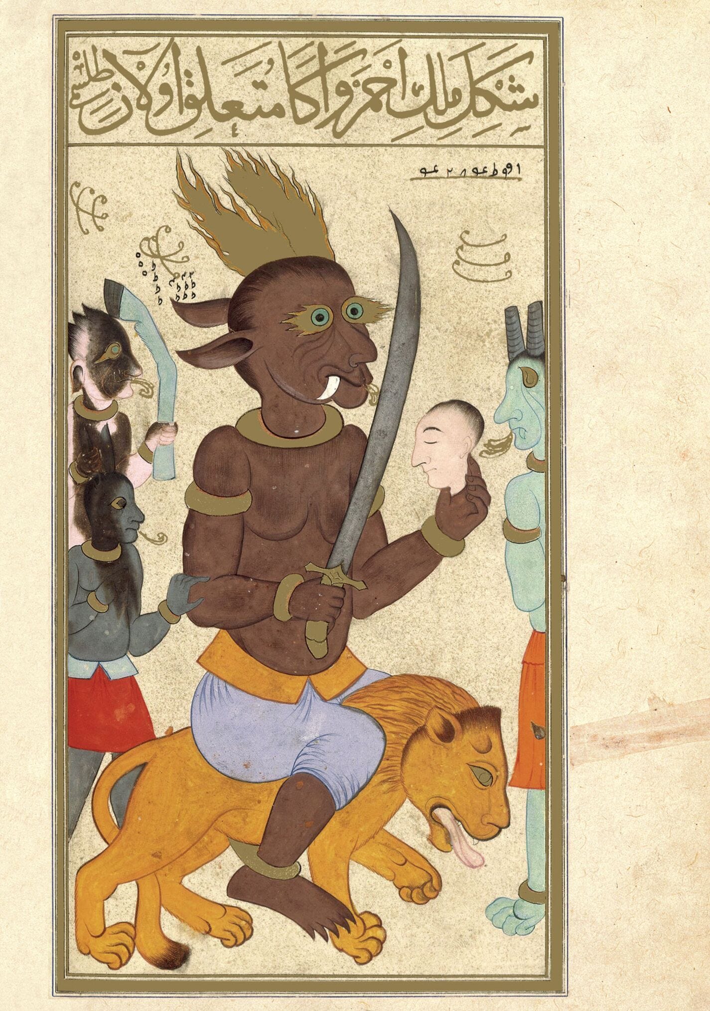 “Image from a copy of Abu Ma’shar al-Balkhi’s Kitab al-mawalid (The Book of Nativities), Egypt (14th Century Manuscript). The Image depicts Tarish, a king of domestic Jinn. He is not listed in some other well known books of jinn, but he bears a close resemblance to the more widely known ‘Red King’ Al-Malik al-Ahmar, who was also depicted riding a lion and is associated with the planet Mars…”