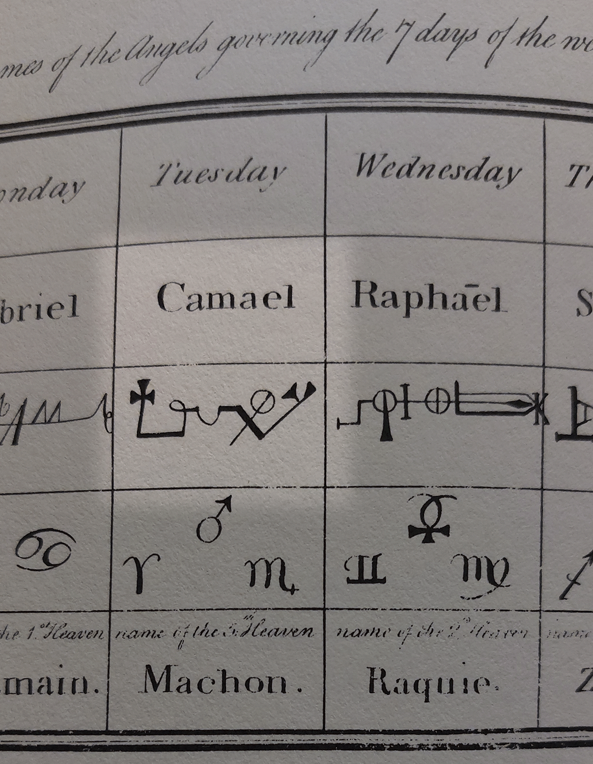 It should be noted that in the text that accompanies this table, the different spirits of the days of the week are detailed, but the ‘Angel of Tuesday’ is named Samael not Camael, seemingly confirming this muddling of the two names as possible variants of the same entity.